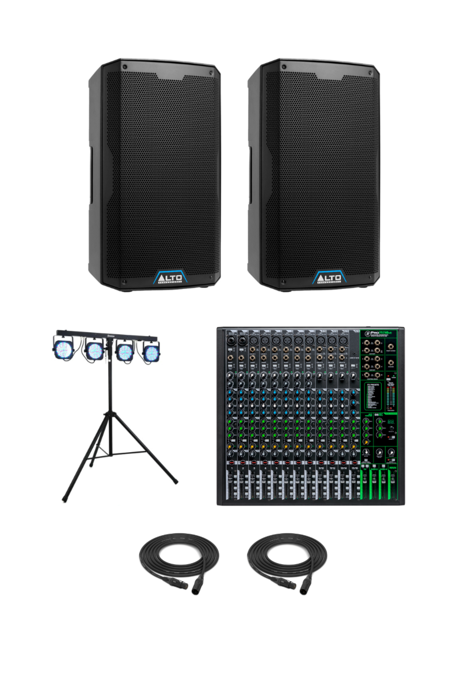 Small and portable, but powerful PA system for announcements, music, or DJs. Includes 2 Alto TS412 speakers (Bluetooth available), Mackie ProFX16v3 mixer, and 1-2 microphones. All necessary stands, cables, setup, teardown, and live engineering included.